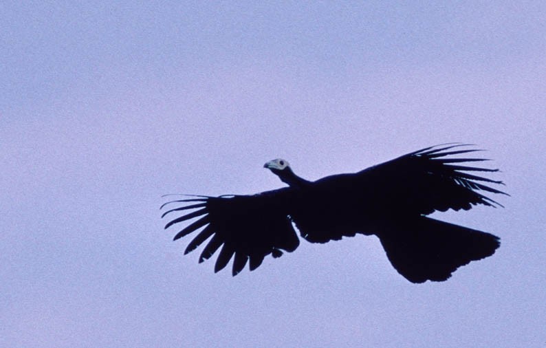 | Trinidad Piping-Guan in flight, illustrating the emarginated primaries used to produce "drumming" sounds. Grande Riviere, Trinidad, 1 April 1999. Photo by Harry Lehto. |