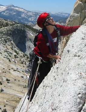 | 15-year-old Brett Hayes contemplating the route above the 3rd pitch of CATHEDRAL PEAK III 5.6, Tuolumne Meadows, CA, June 21, 2007. |