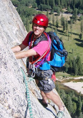 | FAVORITE CLIMBS (in chronological order, with excerpts from climbing journals) SNAKE DIKE III 5.7 Southwest Face of Half Dome, Yosemite Valley, CA, July 23 1982 My first climb. I climbed with Bill Baker, Mark Spencer and Earl Tresenriter. We climbed Sentinnel Dome, Mark and I climbed Mount Broderick, and after a 9 mile hike from Glacier Point we began this climb around 1:30 pm. The first two pitches consist of 5.7 friction and short liebacks. The next six or seven pitches followed a 5.4 dike up the southwest face, protected by bolts every 50 feet or so. Mark led all of the pitches. The last 1000' consisted of class 3 and 4 friction. We arrived at the 8,442' summit of Half Dome at sunset. We climbed down the cables and Earl bivouacked just below the summit. Mark, Bill and I hiked 9 miles down the long, steep trail in the dark with a headlamp. We arrived at Camp Curry at midnight. 2nd ascent on September 12, 2004. Mark Spencer and I began hiking from Yosemite Valley at 6:20 am and arrived at the base of Snake Dike at 9:20 am. Mark began leading at 9:45 am and led all eight pitches on a 8 mm rope 120' long. We climbed simultaneously up four pitches (5.7, 5.7, 5.7, 5.4), with Mark periodically placing tiblocs (to belay me on a fall) and quickdraws on bolts but skipping several. After running out of gear, Mark stopped atop the 5th pitch (5.7, taking the dike variation left of the regular 5.6 pitch) and belayed me after I passed the 5.7 crux. Mark led the last three pitches while I climbed simultaneously; he clipped into bolts on the 6th pitch (5.4) and we climbed the last two pitches (both 5.2) without protection. We finished the climb at 10:45 and hiked up class 2 and 3 slabs to the summit (8,442' ), arriving at 11:30 am. We left the summit at 11:55 am and arrived at Yosemite Valley at 3:15 pm. I guzzled 4.5 quarts of water. It was fun repeating my first climb, again with Mark, 22 years and 1506 climbs later! For more photos, click here. 3rd ascent on September 11, 2008. Roy Benton and I began the hike to Half Dome from the Upper Pines Campground at 4:35 am. After pausing for breakfast, we reached the base of the climb at 8:45 am and began climbing at 9:15 am. I led pitch 1 at 5.7 (170'), placing three cams for protection, pitch 2 at 5.7 (50'), placing two cams and clipping a bolt, and pitch 3 at 5.7 (160'), clipping into two bolts. Roy led pitch 4 at 5.4 (170'?), clipping into one bolt. I led pitch 5 at 5.6 (135'), placing a cam, clipping a bolt and slinging two knobs. Roy led pitch 6 at 5.4 (120'), clipping a bolt and slinging two knobs. I led pitch 7 at 5.2 (100'), placing two cams. Roy led pitch 8 at 5.2 (195'), placing three cams. We carried and used cams 0-5 (six smallest cams); we also carried small nuts but did not use them. After 3 hr and 35 min of climbing, we unroped and continued up class 3-4 slabs, arriving at the 8,842' summit at 1:50 pm. We left the summit at 2:25 pm and arrived at the campground at 6:55 pm. At the top of Nevada Falls we refilled with water using iodine tablets both on the approach and descent; I carried 3 but drank only 2.5 liters up Half Dome. HARDING ROUTE III 5.7 Glacier Point Apron, Yosemite Valley, CA, July 30, 1982 I climbed with 46-year-old Earl Tresenriter. This route consists of about 15 pitches, much of it right-facing laybacks. I led more than half of the pitches, and took a 15' fall about 1000' up on Glacier Point Apron. The climb ended on Glacier Point Terrace about 1500' above the valley floor, which we reached at sunset. We rappelled off bolts down a 80� headwall using a single rope. After about 20 rappels, while using a headlamp, we reached the bottom at midnight. My 2nd climb over 1000'. ROYAL ARCHES III 5.10b Yosemite Valley, CA, August 4, 1982 Mark Spencer and I began climbing at 8:00 am., reaching the top at 2:00 pm. We did the first several pitches, including a 5.6 chimney, unroped. The climb consists of 17 pitches including two pendulums (5.10b if done free; I did it at 5.7 A2), and I did a rope traverse on the last 5.4 pitch. I led the Bear Hug Pitch, First Pendulum Pitch, and the famous Rotten Log Pitch [log removed by climbers a few years later]. My 3rd climb over 1000'. [Afterwards we attempted NORTH DOME� SOUTH FACE III 5.7 but got off-route after climbing 3 pitches and rappelled down, skirted the south wall, and climbed the peak, reaching the 7,542' summit at sunset. We hiked 4.5 miles in the dark to the Tioga Road, climbing Indian Rocks (8,522') on the way. We built a fire and slept in the dirt, alternately getting scorched and then freezing as we awoke and threw more wood in the fire. At 1:45 am. we hitched a ride to Crane Flat. Arriving at 3:00 am, we built another fire and slept until 6:00 am. The temperature went down to 28�F, and we only had on jeans and jean jackets. We hitch-hiked to Yosemite Valley and made it back to Camp Wawona for breakfast.] 2nd ascent on June 18, 2007. Brett Hayes and I began climbing at 5:15 am. I led the entire climb in 16 pitches, although we did not do the final 5.4 pitch on the standard route. We climbed on a 165' 10.5 mm rope and dragged a 200' 10.2 mm rope which we used for the descent via 11 rappels. I led: pitch 1 at 5.6 (110') with three pieces of protection (with a headlamp); pitch 2 simulclimbed at 5.6 (380') with one piece; pitch 3 at 5.5 (160') with no pro; pitch 4 simulclimbed at 4th (240') with no pro; pitch 5 (starting at 7:10 am) at 5.7 (130') with two pieces; pitch 6 at 5.5 (75') with two pieces; pitch 7 at 5.7 (85') with three pieces and a tree sling; pitch 8 at 5.5 (100') with no pro; pitch 9 (our favorite pitch) at 5.6 (120') with four pieces; pitch 10 at 5.10b (125') with five pieces and a fixed line (Brett pendulumned the crux on the fixed line, climbing 5.6 A2); pitch 11 at 5.4 (110') with one piece; pitch 12 at 5.7 (100') with six pieces and a root sling, with final holds on a dead gnarly branch; pitch 13 at 5.6 (60') with two pieces and a horn sling; pitch 14 simulcl