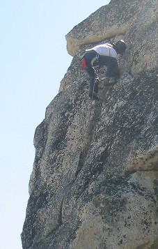 | Leading the crux 14th pitch (5.8) of TENAYA PEAK�NORTHWEST BUTTRESS III 5.8, Tuolumne Meadows, CA, August 13, 2005. Photo by an unknown climber. |