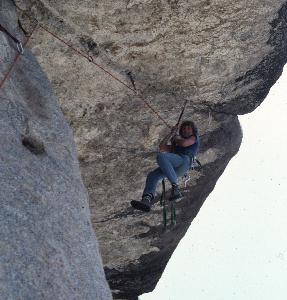 | Leading the spectacular 15' ceiling on the second pitch (A3) of BISHOP'S BALCONY II 5.5 A3, Yosemite Valley, CA, July 22, 1983. Photo by Alison Blythe Carleton. |