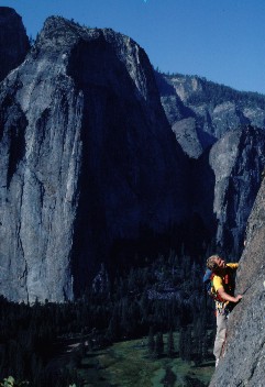 | Mark Spencer leading the 10th pitch (5.7) above and 4th pitch (5.5) below of EL CAPITAN� EAST BUTTRESS IV 5.10b, Yosemite Valley, CA, August 11, 1983. |
