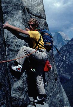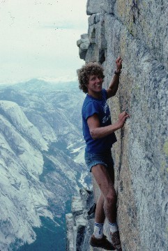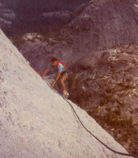 | Yikes! Free-soloing the Northwest Face of Half Dome, Yosemite Valley, CA, 8 July 1983. Photo by Mark Spencer. Actually there is a large ledge just beneath me! No, we didn't climb the entire face... |