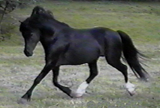 | Snickers is our foundation stallion at Fly High Farm. He has everything we were looking for in a Section A stallion. Great bloodlines, correct conformation, good bone and type, the staightest legs I have ever seen, powerful knee and hock action with an enormous ground-covering stride, and the quietest disposition that I have ever known in a stallion. He is passing on these wonderful qualities to his get. | ||||||||||||||||||||||||||||||||||||||||||||||
