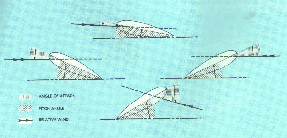 Angle of attack.- The angle of attack is the angle between the chord line of the airfoil and the direction of the relative wind (fig. 5). The angle of attack should not be confused with the pitch angle of the rotor blades. The pitch angle is determined by the position of the appropriate cockpit controls (collective and cyclic pitch), whereas the angle of attack is determined by the direction of the relative wind. The angle of attack may be less than, equal to, or greater than the pitch angle as shown in figure 6. The pilot can increase or decrease the angle of attack by changing the pitch angle of the rotor blades. If the pitch angle is increased, the angle of attack is increased; if the pitch angle is decreased, the angle of attack is decreased. Since the angle of attack is dependent on relative wind, the same factors that affect the relative wind also affect the angle of attack.