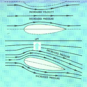 Lift.- The force, lift, is derived from an airfoil through a principle often referred to as Bernoulli's Principle or the "venturi effect." As air velocity increases through the constricted portion of a venturi tube, the pressure decreases. Compare the upper surface of an airfoil with the constriction in the venturi tube (fig. 7). They are very similar. The upper half of the venturi tube is replaced by layers of undisturbed air. Thus, as air flows over the upper surface of an airfoil, the curvature of the airfoil causes an increase in the speed of the airflow. The increased speed of airflow results in a decrease in pressure on the upper surface of the airfoil. At the same time, airflow strikes the lower surface of the airfoil at an angle, building up pressure. The combination of decreased pressure on the upper surface and the increased pressure on the lower surface results in an upward force. This is the force, lift.