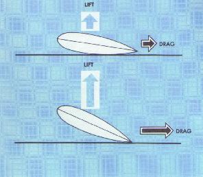 Drag (airfoil).- At the same time the airfoil is producing lift, it also is subject to a drag force. Drag is the term used for the force that tends to resist movement of the airfoil through the air--the retarding force of inertia and wind resistance. Drag acts parallel and in the opposite direction to the movement of the airfoil or, if you prefer, in the same direction as the relative wind. This force, drag, causes a reduction in rotor RPM (revolutions per minute) when the angle of attack is increased. An increase in angle of attack then not only produces an increase in lift, but it also produces an increase in drag (fig. 8).