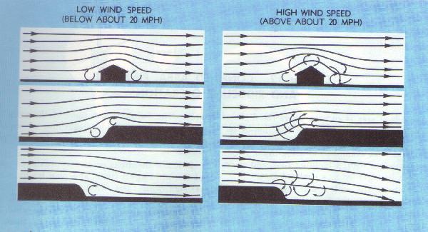 obstruction and the wind velocity govern the severity and height to which