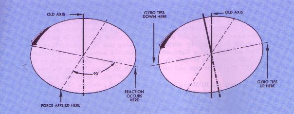 Gyroscopic precession.- The spinning main rotor of a helicopter acts like a gyroscope. As such, it has the properties of gyroscopic action, one of which is precession. Gyroscopic precession is the resultant action or deflection of a spinning object when a force is applied to this object. This action occurs approximately 90° in the direction of rotation from the point where the force is applied (fig. 13). Through the use of this principle, the tip-path plane of the main rotor may be tilted from the horizontal.