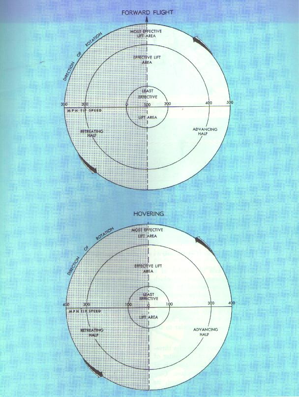 Earlier in this handbook, the statement was made that for any given angle of attack, lift increases as the velocity of the airflow over the airfoil increases. It is apparent that the lift over the advancing blade half of the rotor disc will be greater than the lift over the retreating blade half during horizontal flight, or when hovering in a wind unless some compensation is made. The compensation made to equalize the lift over the two halves of the rotor disc is blade flapping and cyclic feathering. (see chapter 5 for more information about feathering)
