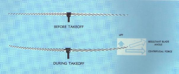 Coning.- Coning is the upward bending of the blades caused by the combined forces of lift and centrifugal force. Before takeoff, the blades rotate in a plane nearly perpendicular to the rotor mast, since centrifugal force is the major force acting on them (fig. 17).