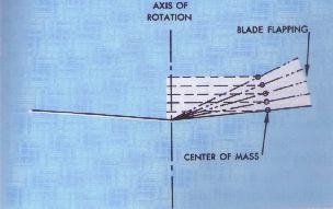 Coriolis effect.- When a rotor blade of a three-bladed rotor system flaps upward, the center of mass of that blade moves closer to the axis of rotation and blade acceleration takes place. Conversely, when that blade flaps downward, its center of mass moves further from the axis of rotation and blade deceleration takes place (fig. 19). (Keep in mind, that due to coning, the rotor blade will not flap below a plane passing through the rotor hub and perpendicular to the axis of rotation.) The acceleration and deceleration actions (often referred to as leading, lagging, or hunting) of the rotor blades are absorbed by either dampers or the blade structure itself, depending upon the design of the rotor system.