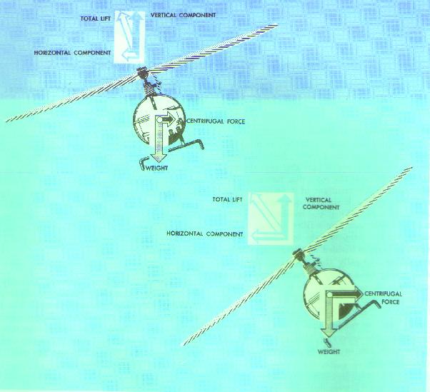 As the angle of bank increases, the total lift force is tilted more toward the horizontal, thus causing the rate of turn to increase because more lift is acting horizontally. Since the resultant lifting force acts more horizontally, the effect of lift acting vertically (vertical component) is decreased (fig. 25). To compensate for this decreased vertical lift, the angle of attack of the rotor blades must be increased in order to maintain altitude. The steeper the angle of bank, the greater the angle of attack of the rotor blades required to maintain altitude. Thus, with an increase in bank and a greater angle of attack, the resultant lifting force will be increased and the rate of turn will be faster.