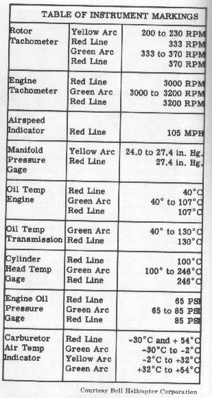Rotor limitations.--Required information in this section of the manual includes limiting rotor RPM's and cautionary ranges. These limitations are marked on the tachometer by red radial lines and yellow arcs respectively, with normal operating ranges marked with a green arc. Here are excerpts from two helicopter flight manuals: