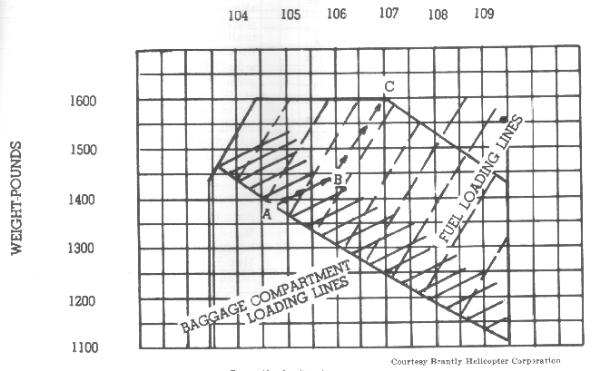 Weight and loading distribution.--This section must include rotorcraft weights and center-of-gravity limits, together with the items of equipment on which the empty weight is based. This will generally require the inclusion of a chart or graph such as that illustrated in figure 41 from which the pilot can compute the center-of-gravity position for any given loading situation. (See weight and balance information for instructions on the use of this chart.)