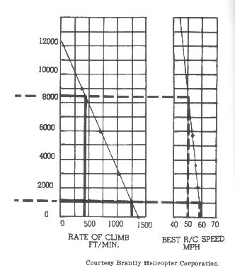 | 3. | The best rate of climb airspeed can be found by moving horizontally from the density altitude point to the diagonal line in the chart on the right side, then moving vertically downward to the bottom line where the airspeed giving the best rate of climb in miles per hour can be read. In the example given in 2 above, it is approximately 57 MPH. At a density altitude of 8,500 feet, the best rate of climb airspeed is approximately 50 MPH and the rate of climb is approximately 425 feet per minute. Maximum allowable wind for safe operations near the surface will be noted by a statement in most flight manuals similar to the following (excerpted from two helicopter flight manuals); | |||||||
