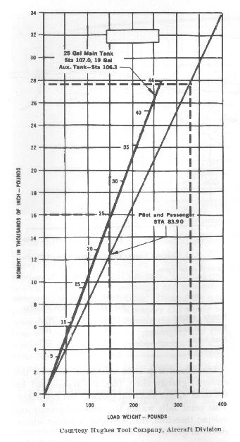 2. The total moments for the fuel load and seat load are found from the loading chart (fig. 48). Locate the diagonal line indicating fuel quantities and stations. Draw a horizontal line from the 25-gallon mark to the left side of the chart the moment is read to be 16.