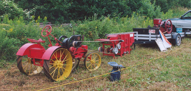 | Special Interest Item. Here are two superb creations by Eddy. The little tractor has a 1915 Fuller Johnson 1 1/2 hp gas engine. The rest of the tractor parts, including 3 speed transmission, came from the junk yard. The tractor is running a scale model Sussex thrasher also made by Eddy. |