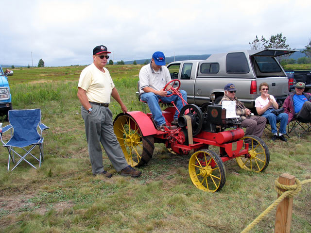| Tractor built by Eddy Faulkner. It is powered by a 1915 1 1/2 hp Fuller Johnson gas engine. Transmission is a 3 speed junk yard special. Wheels are from old farm equipment. |