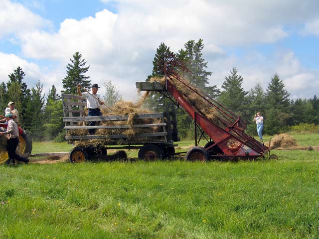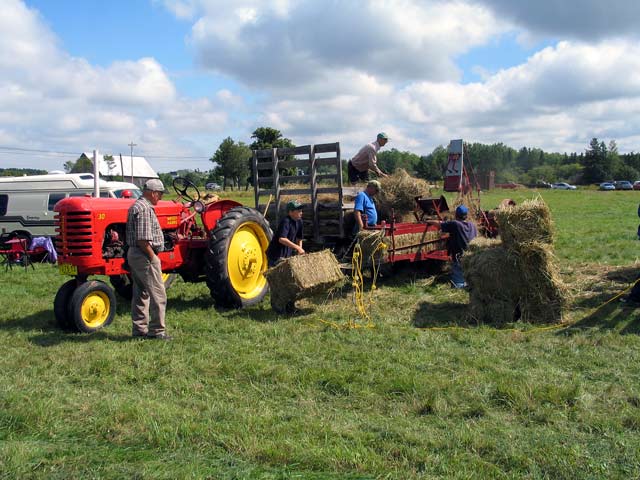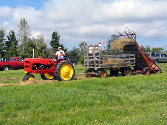 | 1951 Massey Harris 30 with wagon being loaded with bales from hay press. Owned by Ted Embree |