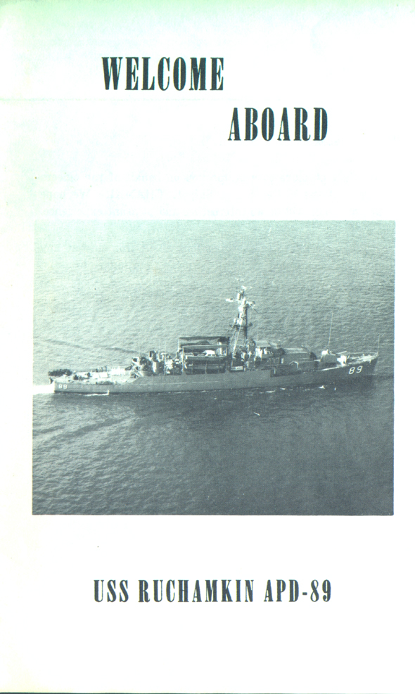 | Welcome aboard: It is a pleasure to welcome you on behalf of the officers and men of the United States Ship RUCHAMKIN. We hope that your visit will be an interesting and pleasant experience. Please feel free to ask questions about this ship at any time. The officers and men will be more than happy to assist you.