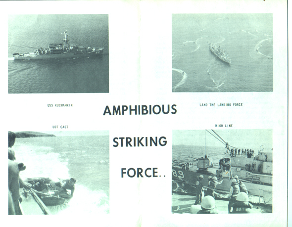 AMPHIBIOUS STRIKING FORCE The Amphibious Force specialized in all naval aspects of amphibious warfare. Its ships include amphibious command ships, assault ships, attack transport and cargo ships, landing ships dock, high speed transports, landing ships tank and assault landing craft. Screening and gunfire support ships are assigned from other type commands as required for each particular amphibious operation. In addition to the ships, the Amphibious Force contains an underwater demolition unit (frogmen), tactical air control group, naval beach group troop training elements and the command and staff structures necessary to plan, train for and carry out the many phases of amphibious warfare. This force, teamed with an embarked landing force, normally composted of unit of the Fleet Marine Force, Atlantic, constitutes a ready integrated fighting team. It is organized, trained and equipped to project sea power ashore in support of our country's national policy, and in response to the needs or requests of our Free World partners. Tailored to meet the varying demands of global tensions, limited or general war, this organization provides a precision instrument of U. S. policy...ready, mobile, versatile, flexible and strong. This is a logistically self-sufficient organization that carries necessary equipment and supplies in sovereign U. S. ships using the seas of the world for their highways. It is ever ready to deploy, fight and stay in position as long as any specific situation requires. This versatile team and Force-in-Readiness capability is maintained and highly developed through constant training and deployment of units of the Atlantic Fleet Marine Force and Amphibious Force. While the majority of our ships are of World War II ventage, our goal is to achieve a 20-knot capability in the entire Amphibious Force. Speed, faster ships and landing craft development of new techniques and the training of dedicated men...are essential to modernization of the Amphibious Force in meeting present and future responsibilities throughout the world. |