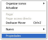 Para cambiar la resolución de tu pantalla debes posicionar el mouse sobre el escritorio de Windows (en un lugar que no tenga íconos). Luego presionar el botón derecho del mouse y seleccionar la opción Propiedades, tal como indica el gráfico: |