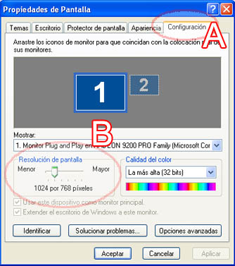 Cuando aprietes sobre Propiedades, aparecerá la ventana de la derecha. En esta ventana selecciona la pestaña Configuración [A] y luego desplaza el selector en la barra de Resolución de pantalla [B], hasta que indique 1024 por 768 pixeles. Una vez hecho esto, aprieta en Aceptar.