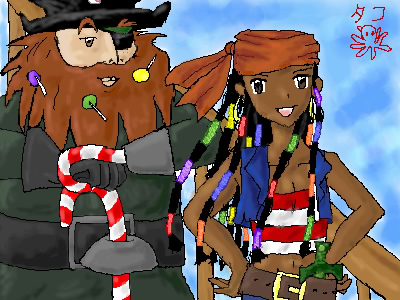 Title: First Mate Comments: This was done in an oekaki program at Kero Kero Oekaki. First of all, I'd like to say that this took me a LONG LONG time, about 4 hours and 20 minutes, according to the timer. I'd also like to say that this is my answer to the hypothetical question, "What if Numbuh 5 had accepted Stickybeard's offer to become a pirate in Operation: P.I.R.A.T.E.?" Well, she'd be sailing the seven suburbs as first mate on the Sweet Revenge. Also, Numbuh 5's hairstyle and head scarf thingy were inspired by Captain Jack Sparrows's (from Pirates of the Caribbean) hair and clothes. Lastly, my version of Stickybeard scares me. Okay.