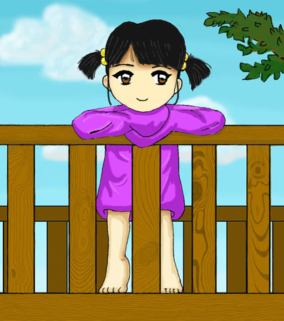 Title: Mushi's Treehouse Comments: It's everyone's favorite little sister, Mushi! I started this out on paper, inked it, scanned it, and then started coloring using the mouse. She originally was sitting on a stool, but her legs were too long, and it's cuter when she's standing and her legs are really short. I originally imagined that she was sitting on a deck in her backyard in front of her house, but later, I didn't like that, so I changed it to a playground/treehouse type thing. This picture took me a reaaaaally long time (about 15 hours)--it took me about 7 hours to do the wood patterns alone--BUT I FINISHED!!