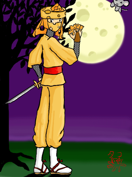Title: Cheese Ninja Comments: Whew, I finished this one! (Took me about 5 hours. �_�) It's a cheese ninja from Operation: T.H.E.-S.H.O.G.U.N. in front of a... swiss cheese moon! Well, it's supposed to be swiss cheese anyway. I tried to make the ninja's costume as accurate--to both the ninja in the episode and to traditional ninjas--as possible. Anyway, this picture was made in much the same way as the Numbuh 86 one, except that this one actually has a background. Now I love Adobe Photoshop. Like the tricolor picture, I had lots of fun using patterns (to make the chain mail under the ninja's jacket). Anyway, I like the holey mask he's wearing--it must be made of cheese cloth!! Ha ha ha ha ha...