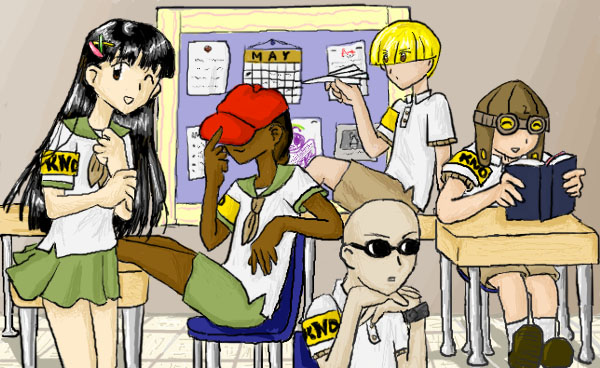 Title: In School Comments: Yay, my first group picture of the KND! Whew, this took me a long time (long time meaning about 2 months *sweatdrop*). Besides taking really long to draw and go over it on the computer, I realized that Numbuhs 1 and 2 were really messed up, so I had to draw them all over again. Well, anyway, this is a suggestion/request-type thing that someone gave me, to draw the KND in school in their uniforms. They're wearing KND arm bands because... I don't know, maybe they want to counter the school's uniforms with their own? I don't really know what I was thinking. ^^;;; Anyway... being the KND, they're all breaking school rules: (right to left) Numbuh 2 - wearing a hat and a pair of goggles. What does he find so amusing about that book? Wait a second, he's reading COMICS behind his textbook!