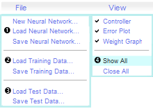 In the fannExplorer menu choose the menu items indicated with numbers - in any order. For example to load the xor sample: