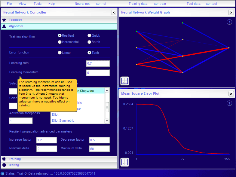 Load (1) xor.net with the Load Neural Network, load (2) xor.train with Load Training Data, load (3) xor.test with