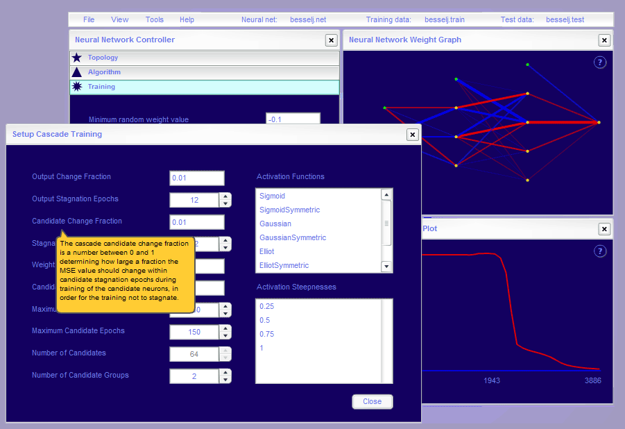 You can try this again with a the BesselJ sample. First load besselj.net, besselj.train and besselj.test as before.