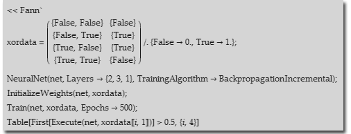 The example below illustrates the simplicity - most of the six lines are created by the palette - with which a neural network can be created, trained and executed with Fann for Mathematica. The neural net will converge to a correct solution of the exclusive or problem about 97% of the time - depending on the initial random weights.