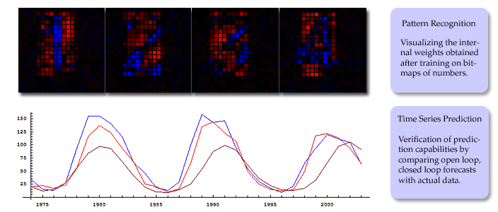 The package includes an introductory user guide, a reference manual - both of which can be integrated into the Mathematica Help system - a palette, that provides easy access to functions, options and object properties and several thoroughly documented examples. The user guide and samples show how to use neural networks for function approximation, pattern recognition, associative memory and time series prediction. |
