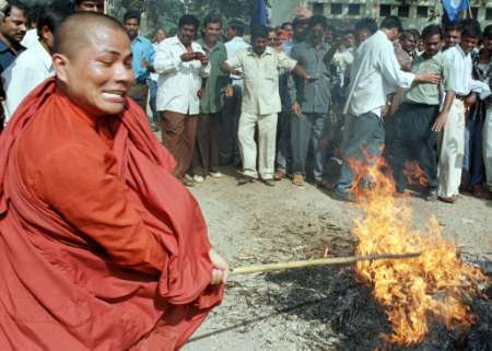 While the barbaric destruction of these ancient statues in the name of some absurd form of Arabo-Judaic iconoclasm is a tragedy, the behavior of the world's Buddhists has been even more troubling. When Buddhist monks are seen walking through the streets of Bombay chanting "death to the Taliban," you wonder if they're really on the path to enlightenment. Buddhist monks beating up mock-Talibs is just as silly as a Mujahedin firing rockets into the groin of a 2,000 year old statue. One question that should be asked is the following: If the Buddha were alive today, assuming he was an historical character, what would he say about this? An honest Buddhist would admit that he would just shrug his shoulders and say nothing more. The ontology of a 150-foot statue does not have anything to do with one's quest for "enlightenment," thus the behavior of the Buddhists seems strangely inappropriate. Then again, the Buddhists these days have gone completely nuts. While we could always rely on the Monotheist Fundos to be violent and irrational, the thought of "Fundamentalist Tibetan Monks" was always seen as a joke. Unfortunately this is not the case. The Buddhists have followed the Muslims' lead, and now they're acting like greedy savages as well. In December of 1998 there was a near riot at the Chogye temple in South Korea, as Buddhist monks fought one another (possibly over rights to parking spaces for their BMWs). Police, acting on a court order, stormed the temple, ending the 40-day standoff between rival monks. However, more than a dozen cops were hurt in scuffles with knife-wielding Buddhist thugs [see image]. As we discuss in the article on Jahannam, Buddhist monks have done some amazing things in protest of threats to their way of life (such as setting themselves ablaze without screaming). Now however, the Buddhist monks are not showing any sort of ability to come up with a creative way to capture the world's attention. Instead they're opting for the tired old Islamic-style objections, which are really quite crude. What this teaches us is that the iconoclasm and intolerance in the Buddhist-Hindu territories has done more than just physical damage. There used to be no such thing as Hindu nationalism, but the Hindus had to create it as a reaction to centuries of Muslim oppression. The destruction of Hindu temples was met centuries later with the destruction of Indian masajeed. Now the Buddhists, having tasted the pain of getting kicked by Christians, Muslims, and Communists, refuse to try and meditate away the bruises; instead, they're picking up clubs and guns, and are ready to join the frey! The term Nirvana literally means "to blow out the flame," so I suppose being a suicide bomber can help one achieve enlightenment as well as a free ticket to Jennah. There is no self; rather everything is nothing, and nothing is everything. TAKBIR! |