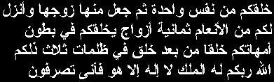 khalaqakum min nafsin waahidatin thumma ja'ala minhaa zawjahaa wa anzala lakum mina al-an'aami thamaaniyata azwaajin yakhluqukum fee butooni ummaahatikum khalqan min ba'di khalqin fee thulumaatin thalaathin dhaalikumu Allahu rabbukum lahu al-mulku la ilaha illa huwa faanna tusrafoona