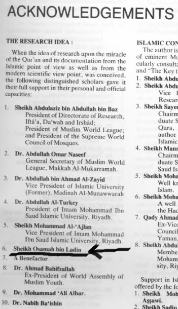 by Sadiqi az-Zindiki Of the many miracles attributed to the Qur'an by proselytizers, one of the most popular has been claims of advanced knowledge of embryology within its pages. This is evidenced by the widespread dissemination of a supporting article by University of Toronto Embryologist Keith L. Moore over the Internet, and in da'wa paperbacks like "The Bible, the Qur’an, and Science." Investigating these claims, I obtained a copy of a special edition textbook Moore co-wrote on the subject "The Developing Human: Clinically Oriented Embryology with Islamic Additions." (ISBN 0-7216-6472-5) Only a short time ago, I was browsing through it when I noticed a name in the Acknowledgements that is now familiar to everyone: "Sheikh Osamah bin Ladin." (Page viii e) Corroborating it being perhaps the very same infamous Bin Ladin, the textbook was published by Saudi Publishers- "Dar Al-Qiblah for Islamic Literature: PO Box 10932, Jeddah 21443, Saudi Arabia." (No idea if the address is current.) The publication date given is 1983, and in the preface it states that it was published "with special permission from W.B. Saunders Company." The Book appears to be the result of collaboration between Moore and a few Saudi Universities: "Mr. Moore…for three years collaborated with the Embryology Committee of the King Abdul-Aziz University in Saudi Arabia for a comparative study on this phenomenon." It is unclear whether Bin Lauden’s involvement was financial or otherwise, which is why I hope that perhaps the in the future the NY Times (who are aware of this fact) might care to elucidate the role of the embryonic terrorist in embryonic miracles. Bin Lauden's name appears. So the paper trail begins... ![]() ![]() The images above are reproduced from the stated sources under the provisions of the copyright law. This allows for the reproduction of portions of copyrighted material for non-commercial, educational purposes. |
