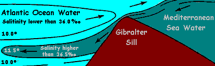 So we see that the pycnocline has been observed in many locations long before the Qur'an was written. To understand the phenomenon, one could perform an experiment that would create a very temporary pycnocline. Get a bowl of cold fresh water. Then get a cup of warm or hot water that has a large amount salt in it. Die the warm salt water with food coloring, and then pour it into the bowl of water from a single point (i.e. pour all the water in the same spot rather than just dumping it in a big splash). You'll see the salt water move some distance through the fesh water without mixing (of course they eventually will start to mix, due to entropy). This same phenomenon happens (to a much greater degree) when two bodies of water, of differing temperatures or salinities, meet. The most commonly cited example by proponents of this polemic is the Gibralter sill, where the Atlantic Ocean meets the Mediterranean Sea: