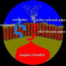 While it is true that basalt is a form of volcanic rock, it is not the same as actual lava. It is not fire, rather it is rock. Shibli has made a logical leap from reading about water being found in fractured volcanic rock to assuming that this means the water is now or once was under any magma. The image on the left is a reproduction of one that appeared in the science section of The New York Times[8], which helps illustrate the difference. As the caption to the image noted, these are "rocks saturated with seawater". Fractured basalt can have water flowing through it if the water flows in from above. Some may argue that this is taking place more than a thousand feet below the ocean floor. That is not a problem, as the relevant Times article described it as being more than a mile below the ocean floor. Nonetheless, the Times still presented this water as flowing in through fractures in the rock.