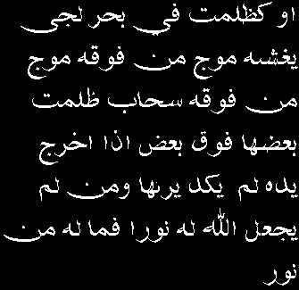 aw kathulumaatin fee baHrin lujjiyyin yaghshaahu mawjun min fawqihi mawjun min fawqihi saHaabun thulumaatun ba'duhaa fawqa ba'din iza akhraja yadahu lam yakad yaraahaa waman lam yaj'ali Allaahu lahu nooran famaa lahu min noorin