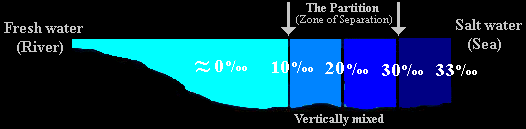 What happens is the water with the lower salinity rises above the water with the higher salinity (as their differences in salinity translate into being differences in density as well). Once you understand this, you can begin to understand why a fresh water body can meet a larger body of salt water, yet the larger body remains salty. Consider now the example of a fresh water stream or river flowing into a body of salt water: