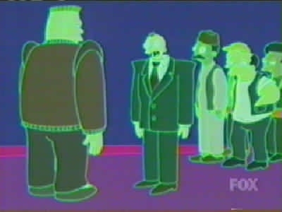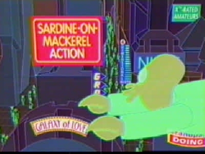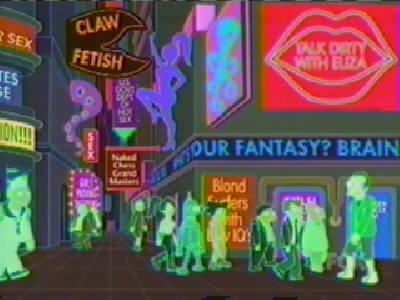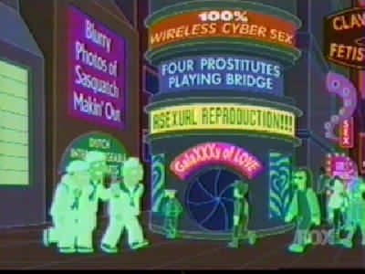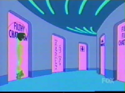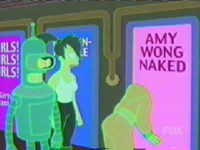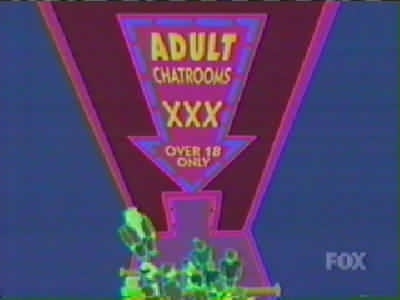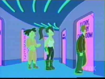 | FUTURAMA CUTS - SEASON 2 9: A BICYCLOPS BUILT FOR TWO (page 1 of 2) - C4 PREMIERE 21.08.01, 18:00 - uncut premiere 15.03.03, 01:00 THE ONE WHERE while playing a video game on the year 3000 internet, Leela meets Alkazar, another cyclops: the only other member of her race she's met. She and PX visit his home planet, but after a while it becomes apparent Alkazar is a jackass. But can Fry and Bender stop him from marrying Leela before it's too late? Is it even her real home planet? RED = DEFINITE CUTS GREEN = WORDS ON SCREEN BLANKED OUT C4 cut more out of ABBFT than any other Futurama episode. The censored version lasted about 20 minutes (including credits, excluding adverts), so it was two or three minutes shorter than it should have been. Whole scenes and conversations were cut out - but www.futuramaoutlet.com/framegrabs had a lot of pics from the episode, a few of which are on the right. The cutting was predominantly in the internet scene, when PX go into the porn part of the 31st-century internet (which is a giant virtual-reality city). Thankfully, in March 2003 C4 came to their senses and, like the previous three episodes of season 2, showed ABBFT uncut in a late-night showing. ------------------------------------------ PX (Fry, Leela, Hermes, Bender, Amy and Zoidberg) are flying over the 31st-century internet, which is in the form of a virtual city: FRY It�s immense! LEELA It�s got every piece of information anyone could ever want. FRY (going past virtual buildings with the words �Sex�, �XXX�, �Porno� and �Virtual Massage�, among others, on them) So I see! (Bender, Fry and Hermes fly off) Woohoo! / Yeah! / Oo-yah! ZOIDBERG What? What�s going on here? (sees a sign for �Sardine-on-mackerel action') Wwoowww! (he flies down too) (Three sailors are among the many people in the net city�s porno section � signs include �Blurry photos of Sasquatch makin� out�, �Four prostitutes playing bridge�, �Asexual reproduction!!!� and �Galaxy of Love�. PX are walking through) AMY (seeing a door with the words �Amy Wong naked� on it, looks in) Hey! That�s me! BENDER No it isn�t, I just took some pictures of your face and stuck them on someone else�s body. LEELA (looks into the door) Hey!! (PX join the queue to get into �Adult chatrooms / XXX / over 18 only') BOUNCER Are you over 18? BOY IN LARGE SUIT Yes! SMALLER BOY IN LARGE SUIT Yes! BABY IN LARGE SUIT (spits out dummy/pacifier and laughs) (Inside, Bender, Fry, Leela and Amy walk down a corridor with many doors in various languages) BENDER I�m telling you, Fry, they�ve got a chatroom for everybody� and here it is! (he points to �Filthy Filthy Chatroom�, and they walk in) AMY Eww! That is so gross. LEELA Yeah. I�ll stick with this one, thank you! AMY Yeah! (they walk into the merely �Filthy Chat Room�) In an unusual bit of cutting, the words �Filthy Filthy� on the first door were blanked out (it didn't look suspicious unless you knew the truth), just leaving the word �chatroom'. (Wide shot of �Filthy Filthy Chatroom�, which is full of people) BENDER (laughs mischievously. Brings down a drop-down list � he scrolls past �New�, �Open� and �Close� to pick �Disguises' � and out of 'Sexy Nurse' and 'Napoleon' chooses 'Sexy Nurse', changing into a (female) nurse.) NURSE [BENDER] (taps man on shoulder) Hi, I�m a naughty nurse, and I really need someone to talk to. $9.95 a minute! MAN Oh! You�re a dollar naughtier than most. (hands over money) NURSE [BENDER] (silence) � so how �bout them Knicks? [they�re a basketball team in case you didn't know] (Amy is at the bar, and looks over to a man whose head changes into a :), then a ;). Amy groans.) AND THAT'S WHERE THE CUTTING OF THIS SCENE ENDS, BUT THAT'S ONLY PAGE 1 OF THIS EPISODE! CLICK 'NEXT' FOR PAGE 2. |