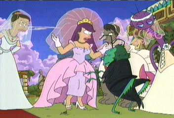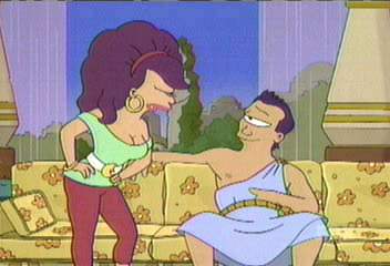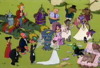 | FUTURAMA CUTS - SEASON 2 9: A BICYCLOPS BUILT FOR TWO (page 2 of 2) - C4 PREMIERE 21.08.01, 18:00 - uncut premiere 15.03.03, 01:00 After all the internet cuts (see previous page), there were more bits of this episode cut out - including the funny, bitchy and often offensive banter between Alkazar and Leela. ------------------------------- During Alkazar�s email to Leela: ALKAZAR (on screen) Fortunately I was able to write down your screen name before I was dispatched by that oafish moron [meaning Fry]. FRY (watching message) (smugly) Kicked your ass� ALKAZAR (on screen) Leela, we have much to discuss� ------------------------------- Later, when Alkazar is ordering Leela about in his castle: ALKAZAR So get to work on these dishes. And then organise my collection of naked celebrity photos by name and what you can see. ------------------------------- Alkazar, Ratman and his girlfriend and Pig are sitting down: LEELA Hey! Where�d you get this couch, and that TV set, and all this stuff? ALKAZAR They were giving it away on the street corner � just like you, Leela! (Pig / Ratman / Ratman�s girlfriend) Whooo! Woof woof woof! LEELA Too bad they weren�t giving away the three things you actually need� This bit looked really bad, with Leela jumping to a different place in the space of one frame. ------------------------------- Seconds later: LEELA (talking about Fry, who�s stuck in the dungeon) Come on Al, can�t you let the little guy out? ALKAZAR Jeez, Leela, twice in one day?! I�m not Superman! (Pig / Ratman / Ratman�s girlfriend go wild and whoop even louder) ------------------------------- At dinner: ALKAZAR Yo Leela, what gives? Pig says your slop tastes like crap! PIG (eating slop out of a trough) Yeah! Like crap! (yet he continues to eat it) -------------------------------- ALKAZAR Not long ago, I spent my lonely nights renting slasher flicks with Ratman and his girlfriend� Kids don't even know what they are! Why censor it? -------------------------------- At the end, Alkazar has just been found out by all of his five wives, and has to explain: ALKAZAR I gave you all what you wanted, and of course I made a few bucks letting Pig watch through the two-way mirror. -------------------------------- LEELA All right, Alkazar � I just have one last question for you. ALKAZAR What�s that? LEELA If you could change form, why didn�t you change it in the one place that counts? (Wide shot of everyone whooping and cheering: Pig / Ratman / Ratman�s girlfriend, PX and the four other wives. Professor is still whooping after everyone stops. Not whooping � the robot who conducted the marriage, Nibbler and Alkazar) The worst thing about this cut is that, in some forced-labour factory in Korea (if that Simpsons Itchy And Scratchy episode is anything to go by), someone probably worked really hard to draw those detailed frames of animation � and C4 censored it! Those nasty pasties. (THE FRAMEGRAB IS BELOW) |
