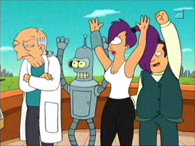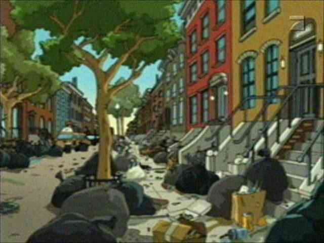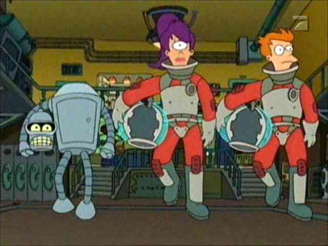 | FUTURAMA CUTS - SEASON 1 8: A BIG PIECE OF GARBAGE THE ONE WHERE Professor is humiliated by his former Mars University student Professor W�rnstrom at the science symposium, but after building a �smelloscope� (a year before) he discovers that a giant ball of trash, fired into space in the 21ST century, is heading for New New York � and will destroy all in its path! ----------------- DEFINITE CUTS ----------------- The Old New York Garbage Crisis movie has just finished. Or, not: FRY (to Professor) Wow, you got that off the internet? In my day, the internet was only used to download pornography. PROFESSOR Actually, that's still true. (Back in the movie, one of the scientists who has just helped to launch the rocket turns to her partner and asks if he might help her with her sexual inhibitions. He agrees to do it "with gusto," and more sensationalist music plays out the remainder of the movie ... as well as a view of the two scientists undressing themselves. Farnsworth doesn't let us see the rest, because he turns the movie off and the lights on. Fry is disappointed by this.) [From The Low-Bandwidth Futurama Site] ----------------- Professor is planning to place an explosion on the garbage-ball: W�RNSTROM You�ll never find a crew willing to take on a mission so suicidally dangerous! (Professor looks hopefully towards Leela, Bender and Fry) BENDER �aw, crap. |