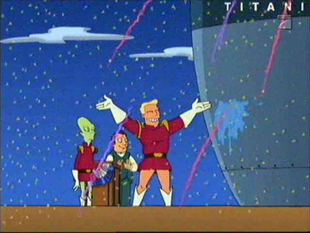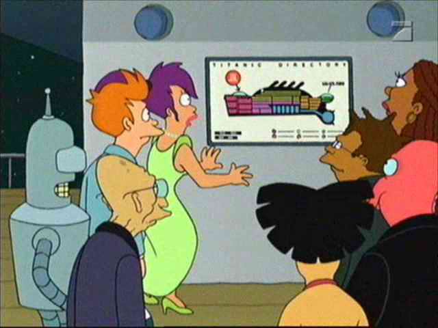 | FUTURAMA CUTS - SEASON 1 10: A FLIGHT TO REMEMBER THE ONE WHERE For the company holiday, PX go on a cruise aboard the great spaceship Titanic, where Leela pretends to be engaged to Fry to avoid Zapp Brannigan�s attentions, while Amy also pretends to be Fry's girlfriend so her parents stop pestering her and telling her to get married. With awkward results! Meanwhile, Brannigan (who�s the captain) decides to liven the ship�s course up by steering through some comets, to give the ship some sort of gravity boost, or something. ---------- DEFINITE CUTS BY C4 DEFINITE CUTS BY SKY ONE ---------- PX are in the crowd, watching Brannigan launch the ship: LEELA Oh, God ... not Zapp Brannigan! ZOIDBERG You know Zapp Brannigan? LEELA Let's just say we've "crossed paths." BENDER Was that before or after you slept with him? BRANNIGAN (talking to crowd) She's a beautiful ship, all right. Shapely. Seductive. I'm gonna fly her brains out. (applause) ---------- INEZ (Amy�s mother) We met the nicest boy in the cabin next to ours. LEO (her father) He's not very ugly. INEZ You should marry him ... or at least use him to conceive a grandchild for us. LEO There he is, at the buffet! AMY Uh ... he seems really nice, but ... well, I already have a boyfriend. INEZ Really? Where is he? LEO And why isn't he here right now fathering our grandchild? ---------- While Leela is kissing Fry while Brannigan�s walking past: BRANNIGAN Leela, perhaps this is an awkward time, but if things don't work out with this pip-squeak here, I just want you to know I'll be there to score you on the rebound. ---------- Just after Fry and Leela almost kissed, but suddenly the ship was jolted: LEELA Oh, my God! We're heading straight into a black hole! (bird's-eye view of the ship) FRY Talk about a mood-killer. Sky One presumably cut this by accident, not because it's offensive, but because the original (US) version began the adverts at this point; Sky cut the ads and this line. ---------- [Thanks for those to various members of the Peel board, and as always The Low-Bandwidth Futurama Site] |