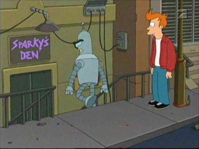 | FUTURAMA CUTS � SEASON 1 9: HELL IS OTHER ROBOTS THE ONE WHERE After a Beastie Boys concert, Bender�s friend Fender (an amplifier) offers him electricity � which is like a drug to robots, and sure enough Bender becomes an addict to this process, unfortunately known as �jacking on�. After hitting rock bottom, he finds religion and becomes a reformed character. But he�s unbearable like that, and Fry and Leela can�t let it stay that way� -------------------------------------------- DEFINITE CUTS / POSSIBLE CUTS BY C4 (most of these aren�t completely accurate, but are pretty close) -------------------------------------------- Channel 4 missed out the opening gag message �Condemned by the Space Pope�, just leaving no joke. Huh? -------------------------------------------- Fender takes Bender into a lonely hallway elsewhere in the building, through a few beaded doorways, into a dark, musky room inhabited by several dark and musky (and quite crummy-looking) robots. The robots are all plugged into a bubbling vase-like device in the center, periodically receiving jolts of electricity from it: BENDER Hey, what kind of party is this? There's no booze and only one hooker. FENDER Don't be a drag, man. We're jackin' on! (Fender plugs himself in, and enjoys a jolt of pleasure) FENDER (offering a wire to Bender) Want a jolt? BENDER (sheepishly) Uh, hey, I'm no square, but isn't that counter-indicated by my operations manual? (the other robots laugh) FENDER Come on, Bender, grab a jack! I told these guys you were cool. BENDER Well ... if jacking on will make strangers think I'm cool ... I'll do it! -------------------------------------------- After a lengthy session on electricity, Bender�s fallen on the pavement: PREACHER Wretched sinner unit! The path to Robot Heaven lies here, in the Good Book 3.0. (he holds up a floppy disk containing the Good Book) BENDER Hey, do I preach to you when you're lyin' stoned in the gutter? No, so beat it! (Preacher shakes his head and leaves) -------------------------------------------- As soon as Bender gets to work, he dashes into the bathroom for more electricity: LEELA If I didn't know better, I'd almost think he was abusing electricity. FRY Bender? No way. (the lights dim for a moment) I definitely would've noticed something. (Leela knocks on the restroom door) LEELA Bender, why are you spending so much time in the bathroom? Are you jacking on in there? BENDER No! Don't come in! -------------------------------------------- After a trip to Sicily 8, the Mob Planet: FRY I know Big Vinny said he was giving me the "kiss of death," but I still think he was gay. LEELA Did he use his tongue? FRY A little. -------------------------------------------- After Bender�s taken the ship through an electrical storm to get another high, nearly destroying it: LEELA Bender, we didn't mind your drinking or your kleptomania or your pornography ring. ZOIDBERG In fact, that's why we loved you. LEELA But this electricity abuse crossed the line. You almost killed us! FRY And you made me feel like a jerk for trusting you. It's just like when my friend Richie swore he wasn't taking drugs, then he sold me my mom's VCR ... and then later I found out he was taking drugs! You make me ashamed to be your friend. BENDER (sadly) Oh, you're right. I'm a lost cause. -------------------------------------------- FRY (gestures elsewhere) And there's Hookerbot 5000. She's got a heart of solid gold! H�BOT 5000 (tempting) Hey, sailing unit! BENDER Stop tempting me! For once in my life I have inner peace. FRY Pfft ... that's for losers. C'mon, sin your heart out. -------------------------------------------- In Robot Hell, the song begins: BENDER Aw, crap ... singing! Mind if I smoke? (the Devil grabs Bender's cigar away, and rubs the flame out against Bender's chest. Singing begins) -------------------------------------------- C4 also cut some of the song: DEVIL Fencing diamonds, fixing cockfights, Publishing indecent magazines. You'll pay for every crime, Knee-deep in electric slime. You'll suffer 'till the end of time, Enduring tortures, most of which rhyme. Trapped forever here in Robot Hell! [Credit: Peel�s Juliet & The Low-Bandwidth Futurama Site] |