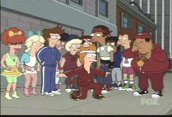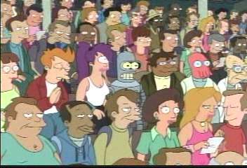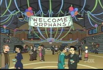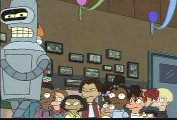 | FUTURAMA CUTS SEASON 3 10: LUCK OF THE FRYRISH C4 PREMIERE 20.11.02, 18:30 THE ONE WHERE We see what Fry�s life was like when he was a kid in 1980s New York � while playing basketball with his jealous and over-competitive brother Yancey, Fry found a seven-leaf clover which gave him luck and let him do great things. But when Yancey tried to steal that, Fry hid it inside the Breakfast Club soundtrack in the record vault in his dad�s nuclear fallout shelter, and never touched it since. But now (i.e. in the future) he wants it back, and goes to the ruins of Old New York� ---------------------- CUTS � none. They even kept in a mention of Run DMC�s Jam Master Jay, who died just weeks before, whereas Fox changed it when someone mentioned the deceased John F Kennedy Jr. in Space Pilot 3000 (the first episode). They also allowed the word �crap� again (and there�d be a riot if they hadn�t!). -------- 11: THE CYBER HOUSE RULES C4 PREMIERE 27.11.02, 18:30 THE ONE WHERE Leela, Fry and Bender go to the reunion of the Orphanarium where Leela grew up, and was bullied by all the other kids because of her single eye. But when she meets the only other successful person at the reunion - Adlai, a doctor, he offers to give her surgery to give her two eyes. Fry�s opposed to this, but she goes through with it and finds that she now blends into crowds, and starts going out with Adlai, but he turns out to be reeeeeally boring. Meanwhile, Bender hears that he�ll get $100 for adopting a child from the Orphanarium � so he adopts twelve! |